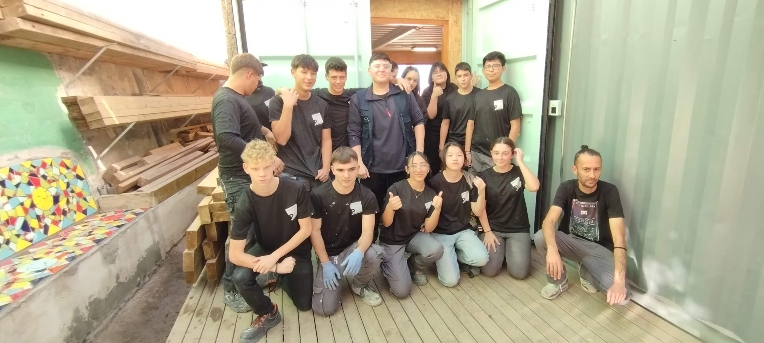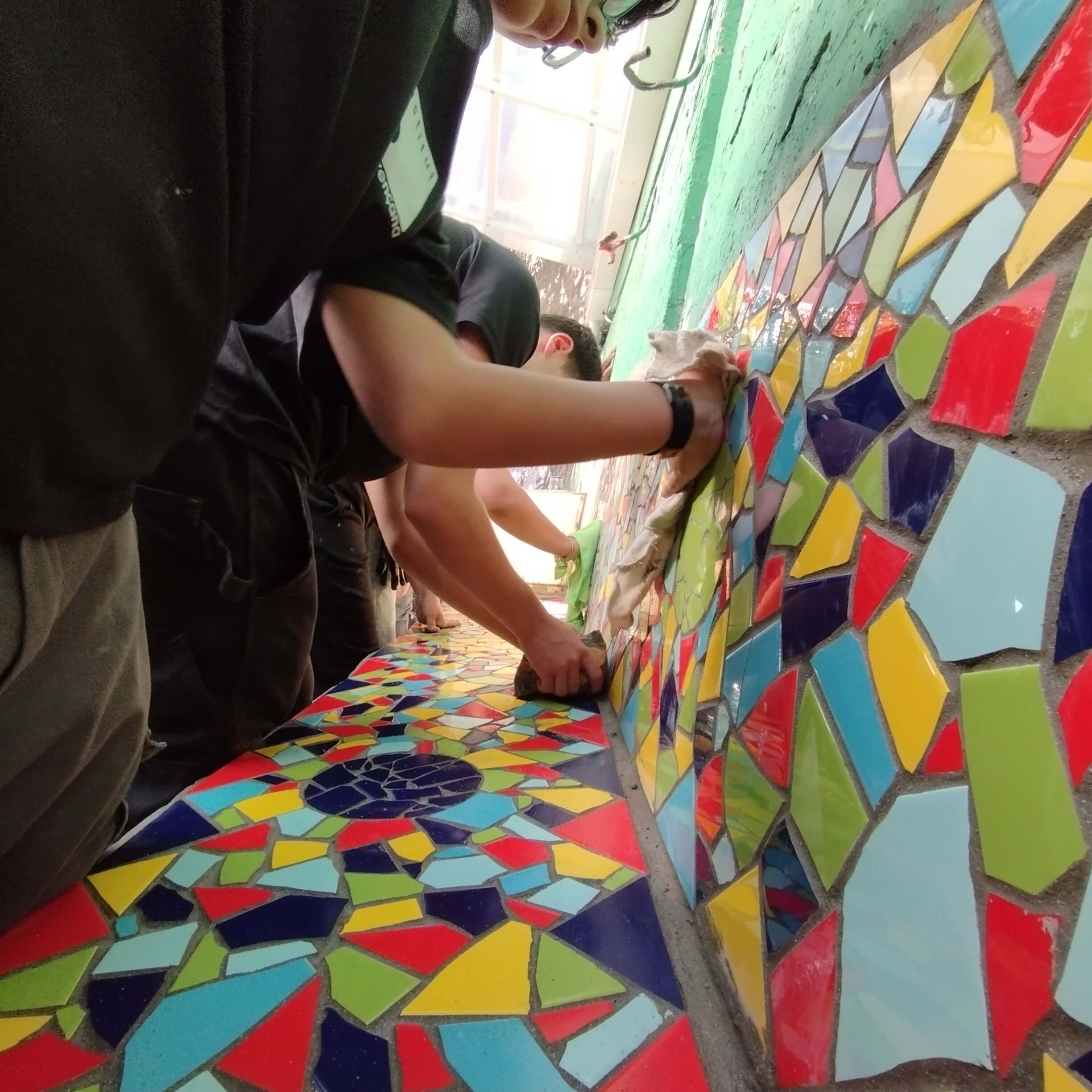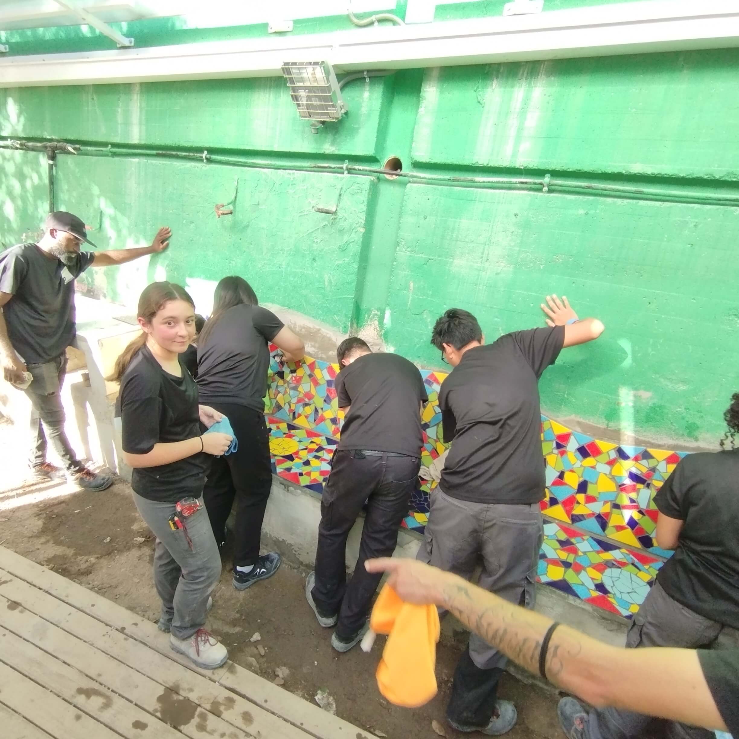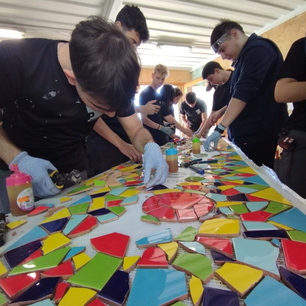 Guiados por La Gloria Factoría de Arte, los estudiantes aprendieron la técnica del trencadís y la aplicaron en un proyecto real, combinando sus conocimientos en construcción con la expresión artística. Esta iniciativa no solo fomentó la creatividad y la colaboración entre los participantes, sino que también les permitió experimentar con una técnica tradicional del mosaico y comprender su aplicación en el espacio urbano.